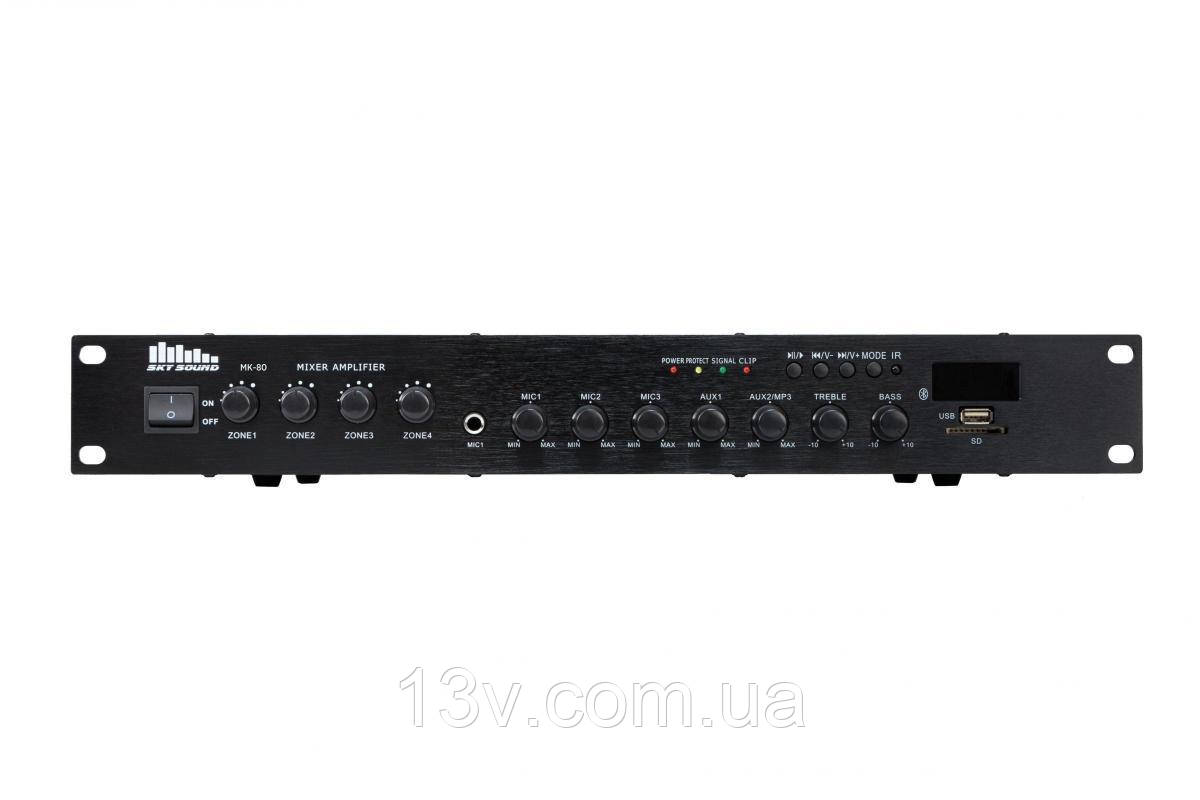 Багатозонний підсилювач потужності SKY SOUND MK-80W призначений для створення невеликих систем трансляції та озвучування приміщень із сумарною потужністю акустики, що під'єднується, не більш ніж 80 ватів. Ця модель трансляційних підсилювачів дає змогу озвучувати приміщення до 4 різних зон (торговельні підприємства, офісні приміщення, кафе, ресторани тощо).